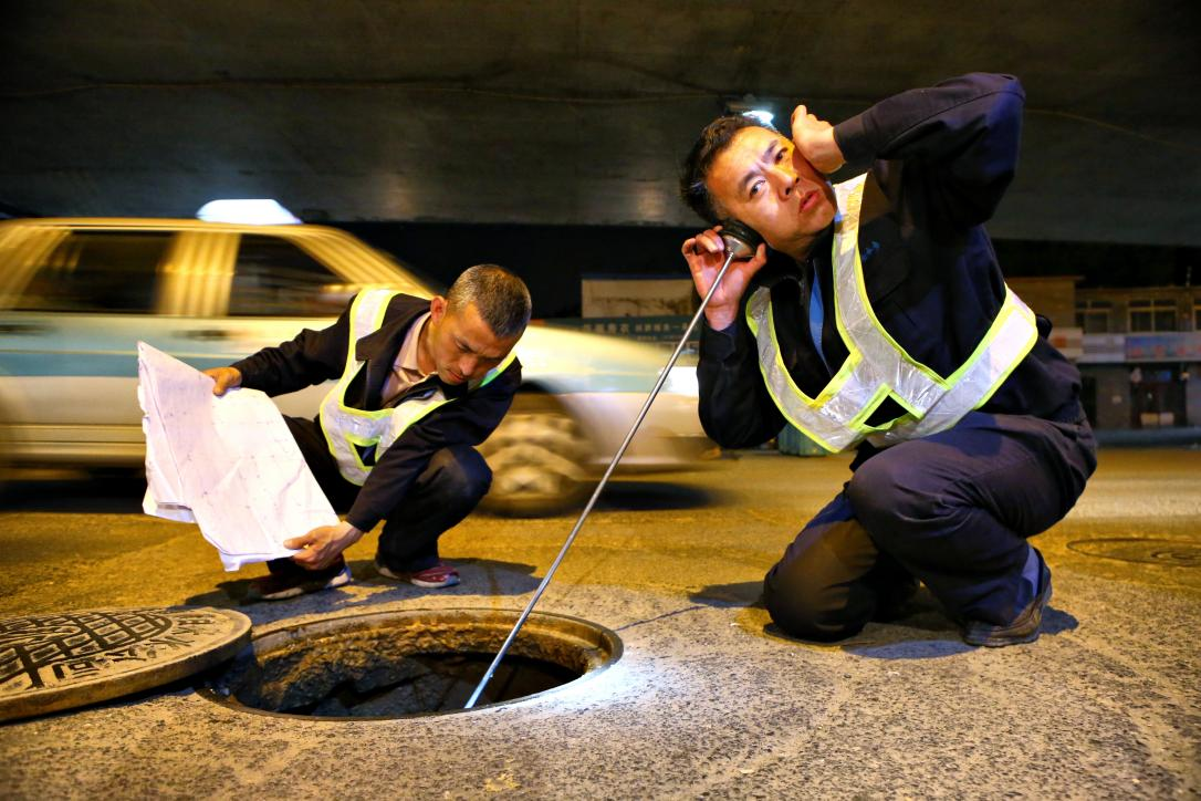 管網(wǎng)檢漏,是降低產(chǎn)銷差的有效措施。圖為檢漏員在疑似漏點周圍的每一處井蓋仔細(xì)探聽